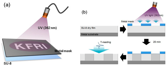 We used commercially available SU-8 dry film as the photoresist material with a thickness of 100 μm (SUEX K100, K1 Solution, Gwangmyeong, Korea). The SU-8 film was laid between a metal substrate and the mask. For UV light exposure, a UV source with a wavelength of 362 nm and intensity of 10 mW/cm2 was used and we exposed the aluminum mask to UV light patterned with characters of “KFRI” for 20 min in a sealed case. The metal mask was fabricated with a size of 7 × 8 mm for each character and the line width was 1.5 mm. After UV treatment, we cooled the sample down to remove the thermal effect and measured its THz characteristics. Figure 1 shows the scheme for the UV light treatment process on an SU-8 dry film.
