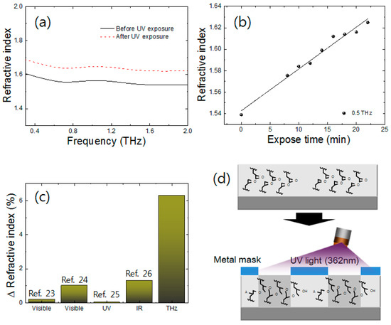 At first glance, we measured the refractive index of SU-8 before and after UV exposure in the frequency range of 0.3–2 THz. We measured the refractive index of the SU-8 film without any treatment. To investigate the effect of UV light on SU-8, we exposed the same SU-8 film to UV light with a wavelength of 362 nm for 20 min. As shown in Figure 2a, there is a significant change in the refractive index of the SU-8 film after UV light exposure. Generally, when SU-8 is exposed to UV light, photon energy is absorbed into the SU-8 film and the photochemical reaction produces an acid [22]. Further, the acid acts as a catalyst during the post-baking exposure. This process promotes a cross-linking between epoxy groups and creates a three-dimensional network. Consequently, cross-linking by UV light causes the SU-8 film to contract and the chemical structure of SU-8 become denser compared to that before UV treatment. This phenomenon affects the change in the refractive index in the THz frequency region significantly. Figure 2c shows the scheme of chemical structural change in SU-8 after UV treatment. Figure 2b shows the exposure-time-dependent refractive index of the SU-8 film at 0.5 THz. The refractive index increases with UV exposure time. This result explains that as the UV light exposure time is increased, the cross-linking is also increased between epoxy groups in the SU-8 material. After UV treatment for 20 min, the refractive index increases up to a value of 1.636. In addition, the refractive index of SU-8 increases linearly. The refractive index change in SU-8 in various regions—such as visible, UV, and infrared (IR)—has been previously investigated [23,24,25,26]. Ong et al. investigated the refractive index of SU-8 in the visible region. In this investigation, an SU-8 film was treated with UV light having an intensity of 15 mW/cm2 with a time interval up to 40 min. Accordingly, the refractive index of the SU-8 film changed less than 0.2% compared to that of the non-treated SU-8 film at visible region. Salazar-Miranda et al., have reported a refractive index change of less than 1% in SU-8 in the visible region after UV treatment. In addition, the refractive index change of SU-8 has been reported with a very small variation in the UV (351 nm) and 1.3% in the IR region. In our results, in contrast, the refractive index of SU-8 changed by approximately 6% more than that before UV treatment in the THz frequency range. Consequently, the refractive index of SU-8 is strongly sensitive at THz frequencies, more than in the visible, UV, and IR regions.