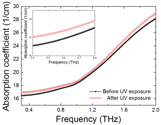 The absorption coefficient of the SU-8 film is measured before and after UV exposure as can be seen in Figure 3. The absorption coefficient is increased after UV treatment. From this result, the absorbance of SU-8 is enhanced by 2–3% at the measured THz range. It can be inferred that due to cross-linkages from UV treatment, THz absorbance is increased.