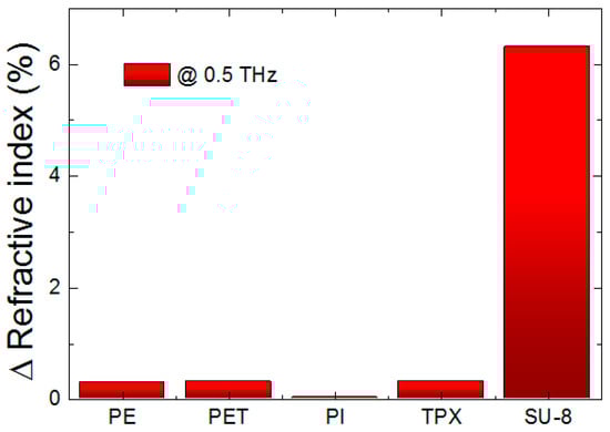 The change ratio of the refractive indices of polyethylene (PE), polyethylene terephthalate (PET), polyimide (PI), polymethylpentene (TPX), and SU-8 at 0.5 THz.