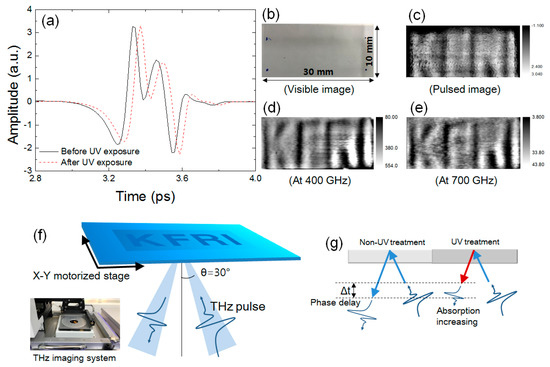 Finally, we investigated the THz image of a character-patterned SU-8 film by UV exposure using a reflective imaging system with THz spectroscopy. To obtain the THz image of the character that is patterned on the SU-8 film, we produced a metal mask patterned as “KFRI” and laid it on the SU-8 film. Then we exposed the SU-8 film to UV light for 20 min. The sample was moved by a two-dimensional X–Y stage and the THz images were obtained with a stage resolution of 100 μm and linear velocity of 30 ms per pixel, as shown in the real image of the THz imaging system shown in Figure 5f. The UV-printed SU-8 film imaged by the THz system is shown in Figure 5b. As can be seen in this figure, the “KFRI” characters are not shown as a visible image. However, the characters can be shown using THz pulses. Figure 5a represented the reflective THz pulsed images reflecting the UV-treated and non-UV-treated SU-8 film. The experimental scheme is shown in Figure 5f after UV light exposure; the phase of the THz pulse is delayed because the refractive index of SU-8 is increased as shown in Figure 5g. This phase delay causes a contrast change in the THz image. Hence, the characters “KFRI” can appear significantly, as shown in Figure 5c. If the sample is thin enough, that is, the time of the THz pulse passing through the sample is shorter than the pulse width of the THz pulse, the Fabry–Pérot effect affects the THz pulse due to multiple reflections. In this case, however, the peak of the THz pulse at time-domain can be separated with a reference THz signal regardless of the Fabry–Pérot effect. Hence, the THz pulsed image can be obtained successfully. Moreover, if the THz pulse with a short pulse width less than the thickness of the sample can be generated, the THz pulse would be obtained without multiple Fabry–Pérot reflections.