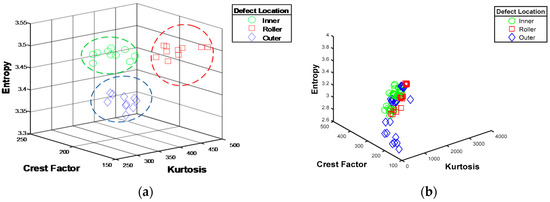 The key difference between CNNs-based techniques and the traditional analysis-based methods is the manner of extracting features. The diagnostic performance of conventional methods depends on the extraction and selection of the best feature set, whereas CNNs can automatically learn the optimal features from their inputs. Traditional AE-based methods for bearing fault diagnosis have mostly been tested under constant operating speeds because variation of the speed results in unstable and inconsistent features, which significantly degrade their diagnostic performance. This is illustrated in Figure 9, which shows the distribution of features extracted from the AE signals for BCI, BCR and BCO faults. When there are no variations in speed, the extracted features can usually be easily separated as shown in Figure 9a. However, variations in speed can lead to overlapping in the feature space, as shown in Figure 9b, which can degrade the diagnostic performance of traditional AE-based methods.