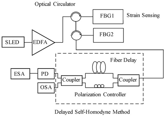 The output from a 1550 nm superluminescent light emitting diode (SLED) from Amonics (ASLD155-200-B-FC), boosted by the erbium-doped optical amplifier (EDFA), is directly injected into the first FBG (FBG1) through an optical circulator. The FBG1 reflection spectrum coupled with the FBG2 signal goes through another optical circulator. The reflective spectra from two FBGs are correlated for analysis through the delayed self-homodyne-based interferometer, as shown in Figure 1. This system uses two couplers to involve two different arm lengths to form the Mach–Zehnder interferometer (MZI). The optical path difference in MZI requires a longer path than the SLED coherence length, and the polarization controller is installed in one of two arms to obtain the highest output power. The two output ports are immediately followed and connected to the OSA and photodetector (PD), respectively, for the optical output characterized using the OSA (HP 70951B) and the electrical output delivered to a 40 Gb/s photodetector (PD; PHYTRE PBR-LTS RX-30-S standard photonics detector) for linewidth measurement. The ESA (Anritsu MS2665C) is utilized to demonstrate the frequency response.
