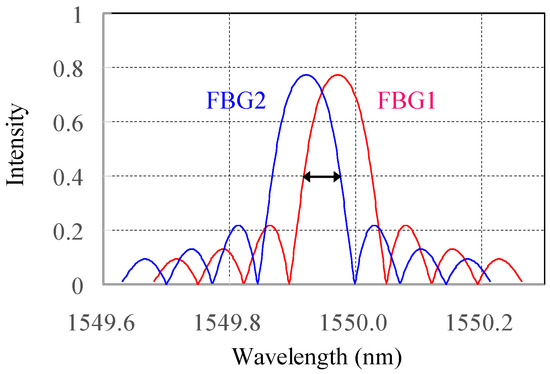 At the beginning, two FBGs with nearly the same reflective spectra are well aligned. The strain value ε of an axially loaded fiber is expressed as the sensing length change ratio to the original fiber length. When strain is applied onto the FBG1 through the stepper motor stage, the reflective FBG1 spectrum moves to the longer wavelength, relative to the FBG2 right spectral side, and the correlated area between the two FBG spectra becomes small, as shown in Figure 2. Since this kind of correlation linewidth on an OSA is not easily resolved due to its limited wavelength resolution of ~0.1 nm, the full width half-maximum (FWHM) of the optical field spectrum is measured using the interferometry-based linewidth characterization. The coherence or incoherence requirement should be carefully considered and satisfied.