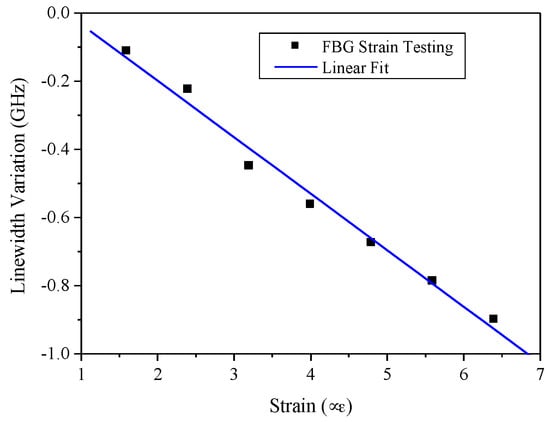 The linewidth information from the ESA through the delayed self-homodyne was analyzed through the implemented strain from 0.8 to 6.4 με. The linewidth decreased because the FBG1 reflective spectrum drifted out of the FBG2 spectrum window. The strain sensitivity for two FBG spectral correlations demonstrates 166 MHz/με with a negative slope and the linear regression, R, is 0.991, as shown in Figure 4. The two FBGs used for these strain experiments were overlapped for around 4 GHz in linewidth. The linewidth decreases when the stepper motor is applied on the FBG. Due to our motor stage limit, the smallest strain we could obtain is 0.8 με. To the best of our knowledge, the photo elastic effect cannot be easily implemented into the fiber Bragg grating for modal calculation. Therefore, we can only conclude that the linear range between the strain and spectral linewidth interrogation is from 0.8 to 6.4 με.