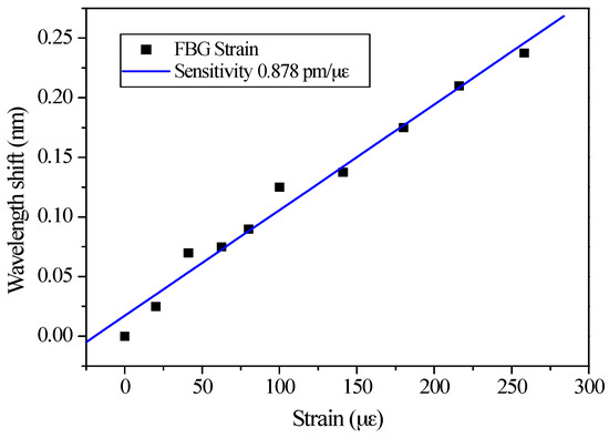 For comparison, Bragg wavelengths were utilized for strain sensing characterization from 25 to 260 με, and the sensitivity was 0.878 pm/με, which means that 1 με requires an approximately 1 pm wavelength resolution in the OSA, as shown in Figure 5. Due to the limited wavelength resolution of 0.01 nm from OSA, the strain from 25 to 260 με is only applied for Bragg wavelength sensing because a strain lower than 25 με could not be detected in the OSA-based wavelength characterization.