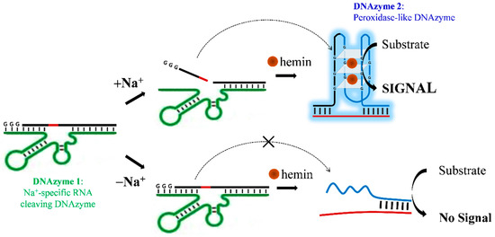 Schematic representation of DNAzyme-based detection of sodium ion (Na+). This assay consists of two different DNAzymes: DNAzyme 1 (Na+-specific RNA-cleaving DNAzyme) as a target recognition element and DNAzyme 2 (peroxidase-like DNAzyme) as a signal generator. The short DNA fragment released by Na+-triggered DNAzyme 1 fully activates DNAzyme 2 in the presence of hemin (co-factor) and the measurement mode can be varied depending on the substrates used.