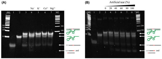 We investigated the Na+-dependent cleavage of dsDNA complex by gel electrophoresis (Figure 2). In Figure 2A,B, when probe 1 (66 bp in lane 2) and probe 2 (30 bp in lane 1) were mixed, a strong new band corresponding to a dsDNA conjugate was observed, with a reduced intensity of each ssDNA (96 bp in lane 3). We incubated this assembly (probes 1 and 2) with different types of ions (Figure 2A) and different concentrations of artificial tears (Figure 2B). As a result, the cleaved band (~15 bp each from probe 2) was observed only in the presence of sodium ion, but not in the other samples (lanes 4–7 in Figure 2A). In addition, artificial tear also showed increased band intensity of the cleaved fragments as the band intensity of dsDNA decreased in a manner proportional to the concentration of artificial tears (lanes 4–8 in Figure 2B). Considering that the artificial tear used in this study contained 127 mM NaCl, 12 mM KCl, 2 mg mL−1 hypromellose (emulsifier), sodium hyaluronate (lubricant), phosphate ions, and sodium hydroxide, sodium ion was a major contributor to this reaction. Therefore, this result strongly indicates that sodium ion in the artificial tear enabled cleavage of the complex of probes 1/2, leading to a rapid release of the short DNA fragment from probe 2.