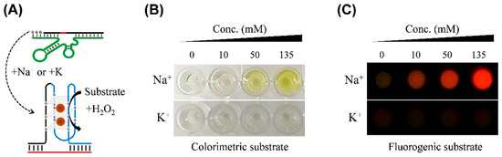 Na+-specific reaction of sequential DNAzymes with different detection mode: (A) schematic of DNAzyme reactions, (B) colorimetric analysis and (C) fluorescent analysis. Each signal by Na+ or K+ ions was compared as a function of concentration (0, 10, 50, and 135 mM).