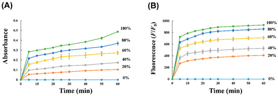 Time-dependent signal generation from sequential DNAzymes at different concentrations of artificial tears. The absorbance was obtained at 650 nm using colorimetric substrate (A) and the fluorescence signal was at excitation/emission wavelengths of 560 nm/580 nm using fluorogenic substrate (B), which monitored every 5 min for 1 h.