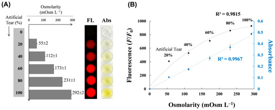 Based on the above results, we examined whether sodium ion concentration was well-correlated with osmolarity in artificial tears (Figure 5). When artificial tears were diluted in distilled water and tested at 0–100% concentration, the osmolarity measured by the osmometer increased in proportion to the concentration, where 100% artificial tear solution (containing 127 mM sodium ions) showed a value of 292 mOsm L−1 (bar graph in Figure 5A). Similarly, the intensities of fluorescence and absorbance images measured by DNAzymes increased in the same concentration range (microplate images in Figure 5A). When two independent data sets were plotted as a function of tear concentration-based osmolarity, there was a hyperbolic dependence in fluorogenic detection (black line in Figure 5B) or linear dependence in colorimetric detection (green line in Figure 5B), with the high coefficients of determination (R2) accounting for the strongly positive relationship between osmolarity and both measurements. This result shows that DNAzyme-based detection of sodium ions in artificial tears is useful for estimating tear osmolarity. Theoretically, tear osmolarity did not represent only the concentration of sodium ions (1 mM NaCl solution generates 2 mOsm L−1) because many other ions or molecules (e.g., glucose, metabolite, and hormone) in tears contributed to total tear osmolarity. However, the change in tear osmolarity is likely proportional to that in sodium ions detected by DNAzymes because the amount of NaCl accounts for approximately 90% of total tear osmolarity. Notably, elevated osmolarity in tears is primarily related to increased levels of sodium chloride [23]. Particularly, considering that tear osmolarity in dry eye can reach more than 13–34 mOsm L−1 than that in normal tear drops [24,25], this change in osmolarity is equivalent to the signal change in the amount of 7–17 mM increase in sodium ions or 10% increase in artificial tears, supporting that our data can discriminate the dryness in tear drops by salinity or osmolarity.