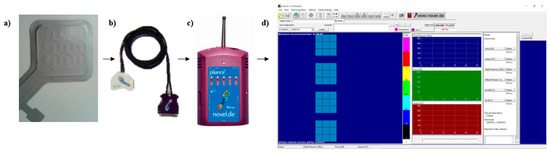 The response of four Novel sensors, named in the following 058, 059, 060, 061, model Socket Sensor XL S2004 (Figure 1a) under different loading conditions has been experimentally assessed. These sensors consist of a capacitance transducers matrix whose single sensory element has an area of 1 cm2. Each element consists of a hollow wave-shaped active region and a raised wave-shaped inactive one. The sensor presents 9 sensory elements organized in a 3 × 3 matrix. The measuring range of the sensory element is 3 kPa–200 kPa (0.3 N–20 N). Each sensor has been connected to a Novel box (Figure 1c) for the signal acquisition and processing through a connection cable (Figure 1b), which enables data elaboration and communication. Data are transmitted from the Novel box to a computer by means of a Bluetooth communication enabled by a communication key. Data have been collected using a sampling frequency of 50 Hz and have been sent to a computer by means of a Bluetooth communication. The pliance-x online 16 Expert software (Figure 1d shows the software interface) has been used to record and plot contact area, total pressure and total force. The total force measured by the sensor matrix at a given time t is computed as