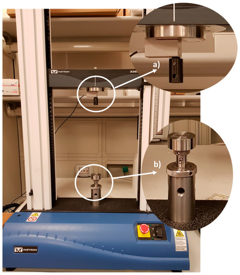 The traction/compression testing machine Instron 3365. With white circles are highlighted: (a) The load cell to which the probe is applied; (b) The flat support for sensor positioning.