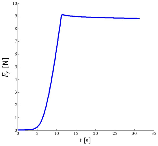 The force has been applied by setting two parameters. The first one is the load speed, set to 2 mm∙min−1. The second one is the maximum value of the force to be applied by the Instron during the experiment. Force values from 1 N to 9 N in order to assess the sensor response in the whole range of interest. At the end of each experiment, the load applied on the sensor has been acquired for 10 s during the plateau (with reference to Figure 3, the force has been considered in the interval from 15 s to 25 s) to record the steady-state response of the sensor. Figure 3 shows a typical trend of the applied force with a maximum value of 9 N. For each value, three acquisitions were made under repeatability conditions [31]. The low number of trials has been taken into account for computing the coverage factor to estimate the expended uncertainty: the lower the number of trials the bigger the coverage factor [31]. Indeed, a t-student distribution with 2 degrees of freedom (number of trials −1) has been used. In Figure 3, the depth of the curve represents the mean value ± the standard deviation of the force recorded during the three trials. Due to the high repeatability in the measure, the standard deviation value is low (i.e., the maximum calculated value is about 0.07 N).