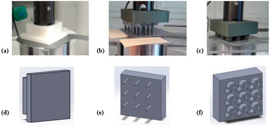 Experimental procedure of coupling between the sensor and the loading probe employed for the three configurations: (a) Distributed load; (b) 9 Tips load; (c) Wave-shaped load. In (d–f) is shown the 3D CAD for the three configurations.