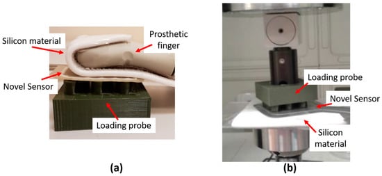 In order to replicate human-like grasping condition, the contact between the human fingertip and the sensor has been mimicked by positioning a silicon material on the sensor surface opposite to the probe (Figure 6). The material, taken from a cosmetic glove used in commercial prosthesis (i.e., the Steeper silicone cosmetic glove [32]), wants to emulate the softness of human skin. In Figure 6a, the real grasping condition is shown: the prosthetic finger, covered by the silicone cosmetic glove, is in contact with the sensor positioned on the loading probe placed on the object to be grasped. The mimicked version of the real grasping condition is shown in Figure 6b, where the prosthetic finger is simulated by the rigid component under the silicone material. The experiments were performed under the two loading conditions that reached the best performance (i.e., 9 Tips load and Wave-shaped load), as shown in Section 3.