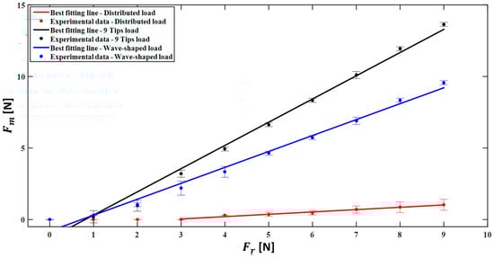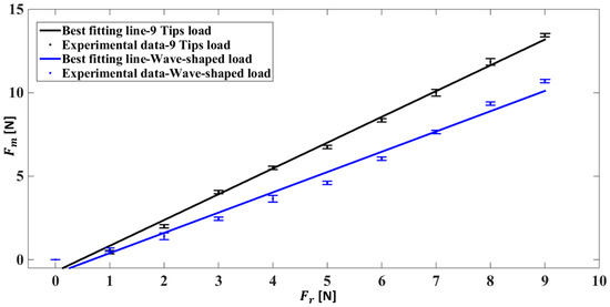 Figure 7 shows the relationship between and for the Socket Sensor XL S2004–060. values are reported as mean value ± expanded uncertainty over the three repeated trials for each applied load (e.g., for an applied load of 9 N, the following values of were measured: 1.03 ± 0.15 N for the Distributed load, 13.63 ± 0.06 N for the 9 Tips load, 9.57 ± 0.06 N for the Wave-shaped load). The expanded uncertainty has been estimated considering a Student reference distribution with 2 degrees of freedom and a level of confidence of 95%, as recommended in [31]. In Figure 7, the error bars represent the confidence intervals considering the expanded uncertainty calculated using the t-student reference distribution.