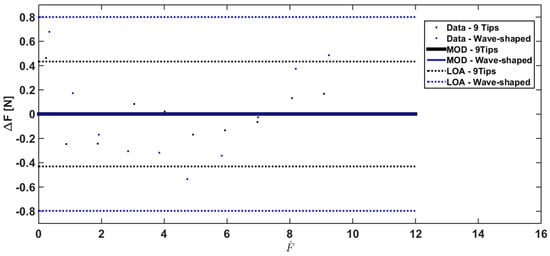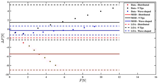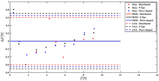 The Bland Altman analysis shown in Figure 10 points out a marked underestimation of the force applied when the Distributed load is used (MOD = −5.47 N), a slight underestimation using Wave-shaped load (MOD = −0.2 N), and a marked overestimation using the 9 tips load (MOD = +1.8 N). The agreement between the reference force values and the measured ones largely improve when a correction based on a linear model is used; indeed the MOD is almost null considering all the three loading conditions (Figure 10).