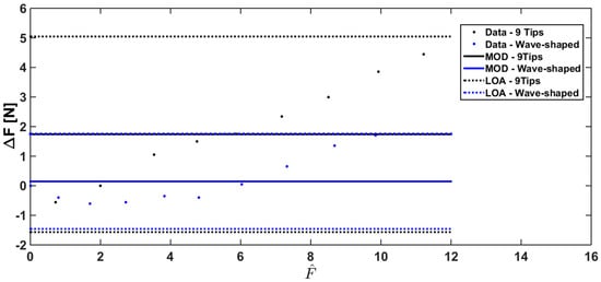Bland Altman analysis comparing with for the two loading conditions under human-like grasping conditions (results obtained with the 9 Tips load and with the Wave-shaped load are shown in black and in blue, respectively).