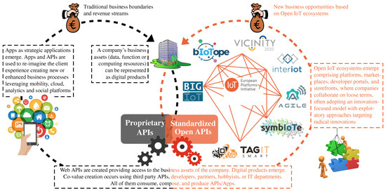 While in the US, IoT ecosystems are created around big, multinational players such as Google, Amazon, Facebook and Apple—so-called GAFA [20]—the EU’s strength is rather in smaller and agile companies [21]. In this respect, the EU launched various initiatives to foster the emergence of open innovation ecosystems enabling and incentivizing public and private institutions, as well as citizen communities, to join and contribute to the growth and sustainability of the established ecosystems. Among other initiatives, the AIOTI alliance (https://aioti.eu, last accessed October 2017), consisting of 13 Work Groups (focusing on security, standards, smart mobility, healthcare, etc.), was launched to make recommendations for future collaborative work in the context of the IoT Focus Area in the H2020 EU programme. As part of AIOTI, a sub-alliance named IoT-EPI (IoT-European Platforms Initiative), composed of 7 Research and Innovation (R&I) projects funded under the ICT30 cluster (2016–2019), has been initiated with the aim to turn existing vertically-oriented platforms and services into economically viable IoT ecosystems [5]. Figure 1 provides an at-a-glance overview of the desired impact from an “API economy” perspective [22,23], which, as stated by IBM [24]:
