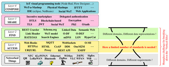 An important prerequisite for a successful open IoT ecosystem is to create a solid foundation, both technologically and economically viable, to ensure its take up by end-users. This includes establishing appropriate strategies to incentivize them in publishing and/or consuming IoT data/services, including the provision of secure and trustable services (e.g., with more open/intuitive solutions that help end-users to choose to start or stop sharing data) [19] to the provision of some kind of a digital marketplace through which end-users can trade personal data and/or services [25]. To accomplish this, it is important to define and implement the right building blocks to efficiently find, share and compose distributed and heterogeneous data sources in the IoT. This has been illustrated through the four-layer structure given in Figure 2, which has been adapted from [7]. Section 2.1, Section 2.2, Section 2.3, Section 2.4 and Section 2.5 discuss more thoroughly the ongoing research and development for each of these layers, along with challenges that remain to be solved for creating successful open IoT ecosystems.