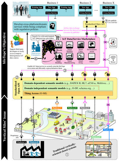 Figure 2 shows—through stage denoted by ➀—that bIoTope leverages the available vertically-oriented platforms and cloud endpoints, thus following the logic discussed in Section 2.1 (i.e., not imposing any messaging protocol at the “Networked Things” layer).