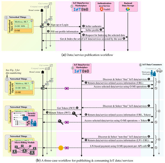 It should be stressed here that, at the marketplace level, only the “description” of what the data stream or web service is about, and how to call it, is collected and indexed by the O-MI search engine. Technically speaking, only the semantic models specified at the FIND layer of each IoT gateway is indexed in the service catalog, and not the underpinning data streams generated at the “Networked Things” layer. Indeed, once data consumers have found valuable data source descriptions via IoTBnB, agreed upon the terms and potentially paid for accessing the underlying resources, they can start communicating in a peer-to-peer manner with the corresponding IoT gateway(s), as illustrated through stage denoted by ➄ in Figure 2. So far, three distinct publication and consumption schemes are made possible in the bIoTope ecosystem, as summarized in Figure 4 (cf. Case 1–3).