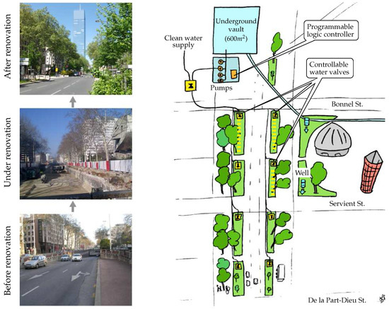 Métropole de Lyon has been carrying out UHI measurement campaigns using temporary or mobile sensors. However, partners of the territory, and in particular researchers focusing on the modelling of UHI phenomena and its impact on citizens, would like now to benefit from a true IoT network in order to carry out more rigorous studies. Within this context, the Garibaldi street, which is located in the heart of a business district in Lyon and is the subject of a large-scale urban renewal project, has undergone a fundamental transformation/renovation in 2014 in order to enable IoT experiments. The different steps of this transformation are shown in Figure 6 (left side) through three pictures showing the Garibaldi street before, under, and after renovation. An interesting feature of this street is that there was an underground vault of , which has been repurposed to store rainwater which can be used to clean the streets, to refill street sweepers, or to water green areas. In this respect, and as highlighted in Figure 6 and Figure 7, the street-planted strips have water inlet connections to the pumps in this basin. During summer 2016, four green areas were equipped with various kinds of sensors, in particular, air temperature sensors (for UHI phenomenon analyses), soil moisture and tree activity/health sensors (for monitoring the watering needs of plants). Remote controllable pumps and valves (for irrigation control management) were also installed. These devices and associated communication protocols are summarized in Figure 7. Since this pilot is intended to be an experiment space, three distinct communication protocols are used, namely: (i) LoRa network: allows for the collection of temperature data (on an half-hourly basis); (ii) Sigfox network: allows for the collection of both soil moisture and tree activity data (on a half-hourly basis, too); (iii) Proprietary STELLA network: allows for the collection of water level data, as well as for the control of the water pumps and valves.