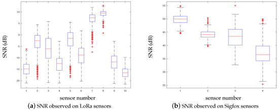 Whenever a measure of temperature and tree growth is collected by the LoRa and Sigfox networks, the Signal-to-Noise Ratio (SNR) is measured and recorded. Even though the objective is not to compare LoRa and Sigfox technologies, it can be observed that the SNR values are better for Sigfox (cf. Figure 8b). On the other hand, LoRa technology does not necessarily imply to rely on a service provider/network operator; each person who owns a LoRa antenna/gateway can actually grant access to any third party. Such independency is an important aspect when dealing with/stepping into “open” IoT ecosystems. As a result, we have tested the LoRa network by installing our own LoRa gateways (Kerlink Wirnet Station 868 MHz ISM band, sensitivity up to dBm) in the office of Métropole de Lyon with street temperature sensors within a 1 km radius (exact distances are given in Table 2). The objective of this experiment is to understand how the LoRa network/protocol behaves in urban environment settings. As shown in the Figure 8 but also in Figure 9, the small Received Signal Strength Indication—RSSI—(around −110/−120 dBm) and negative SNR values would suggest that the data was sent by devices that are located too far from the gateways. However, these results are mainly due to urban obstacles that impact on the signal intensity. Furthermore, we observed that the greater the radius distance between the antenna and sensor, the higher the daily packet loss.