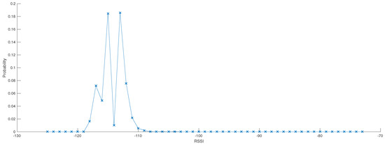 Probability-density function of RSSI (dBm) observed with LoRa sensors over a 2 month period.