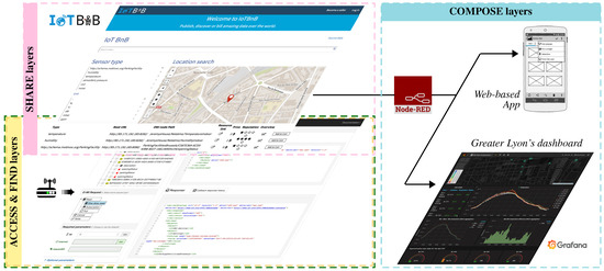 As part of the seven R&I projects composing IoT-EPI, the bIoTope project that stands for “Building an IoT OPen innovation Ecosystem for connected smart objects” (http://www.biotope-project.eu, last accessed October 2017) focuses on solving the “Hourglass challenge” previously introduced in Figure 2 (i.e., addressing the ACCESS and FIND layers). Also, a more in-depth overview of the bIoTope ecosystem is given in Figure 3, highlighting the key building blocks set up at each layer of the bIoTope ecosystem (the color set used for each layer in Figure 2 has been reused in Figure 3). Section 3.1 details the building blocks being specified and developed at the ACCESS/FIND layers, while Section 3.2 focuses on the ones at the SHARE/COMPOSE layer. Technologies used at the Networked Things layer is pilot-dependent, and thus will be discussed for the Métropole de Lyon’s pilot in Section 4.