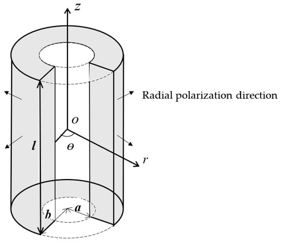 A piezoelectric cylindrical transducer polarized in the radial direction is shown in Figure 1. In the cylindrical coordinate system, a, b, and l represent the inner radius, the outer radius, and the length. The piezoelectric transducer is considered as mechanically unloaded. The polarization direction is along the plane radial direction and it is denoted by the four arrows. The external exciting electric field is parallel to the polarization direction.