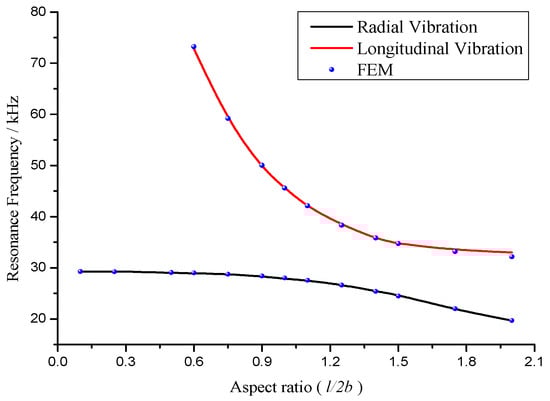 In addition, the finite element method (FEM) is used to compute the radial and longitudinal resonance frequencies on different aspect ratios. The simulated resonance frequencies are illustrated in Figure 2. It is found that the theoretical results are in good agreement with the simulated results.