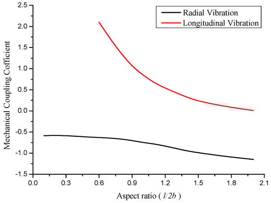 Figure 3 demonstrates the effect of aspect ratio on the corresponding radial and longitudinal mechanical coupling coefficients. From the resonance frequency equations, two kinds of mechanical coupling coefficients are found. The negative mechanical coupling coefficient corresponds to the radial vibration, and the positive to the longitudinal vibration. When the aspect ratio increases, the values of mechanical coupling coefficients decrease. At the aspect ratio of 0.9 < l/2b < 1.5, the mechanical coupling coefficients are at the vicinity of 1. The coupling of radial and longitudinal vibration is strong. At the aspect ratio of l/2b < 0.9 and l/2b > 1.5, the coupled vibration is considered weak.