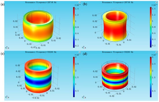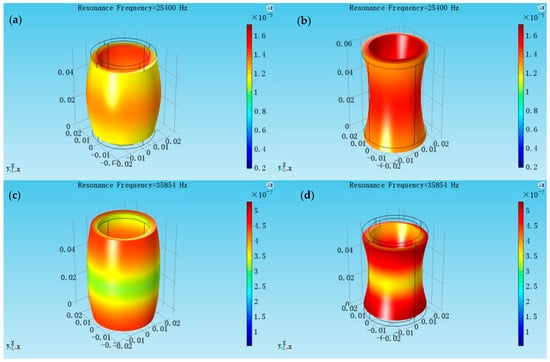 The coupled vibration modes of the cylindrical transducer at aspect ratio of l/2b = 0.75. (a,b) The radial extensional vibration mode of the coupled vibration; (c,d) The longitudinal extensional vibration mode of the coupled vibration.