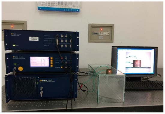 To verify the theoretical analyses of coupled vibration, a radially polarized piezoelectric cylindrical transducer made of PZT-4, with the inner radius a = 0.016 m, the outer radius b = 0.02 m, and the length l = 0.03 m was manufactured. The resonance frequencies of the cylindrical transducer are measured by the Polytec-400 scanning vibrometer (Polytec, Waldbronn, Germany). The measured results are listed in Table 2.