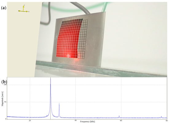 In addition, to present the surface vibrational distributions of the piezoelectric cylindrical transducer in coupled vibrations, Polytec scanning vibrometer (Polytec, Waldbronn, Germany) is used. In the measurement, a frequency-sweeping electric signal produced by Polytec OFV-5000 vibrometer controller is applied to the inside and outside surfaces of the piezoelectric cylinder. By means of the piezoelectric effect, mechanical vibration is produced and it excites the cylinder to vibrate. At the output end of the cylindrical transducer, Polytec PSV-400 laser scanning head automatically measures the vibration distribution on the surfaces. The experimental setup of the piezoelectric transducer is illustrated in Figure 6. The vibrational displacement distributions and frequency responses of the cylindrical transducer are recorded in Figure 7 and Figure 8, respectively. Figure 7a presents the radial vibrational distribution on the side surface of the transducer at the first resonance frequency. Figure 7b is the frequency-radial vibrational velocity curve. In the frequency response pattern, the frequency corresponding to the velocity peak is the radial resonance frequencies of the cylindrical transducer. Figure 8a illustrates the longitudinal vibrational distribution on the end surface of the cylindrical transducer at the longitudinal resonance frequency. Figure 8b is the frequency-longitudinal vibrational velocity curve. In the frequency response pattern, the frequency corresponding to the velocity peak is the longitudinal resonance frequency of the cylindrical transducer.