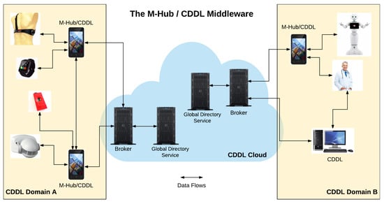 Figure 1 illustrates the use of the M-Hub/CDDL infrastructure in a scenario known as Ambient Assisted Living (AAL). In this scenario, monitored patients use a body sensor network that provides data related to their health status and a smartphone running the M-Hub/CDDL for collecting sensor data and distributing it through brokers located in a cloud. The health sensor data can be delivered to physicians, caregivers and the patient’s family members. This scenario is an example of IoMT, since it assumes unrestricted mobility of wearable/portable sensors, local gateways, and consumer applications running on mobile devices.