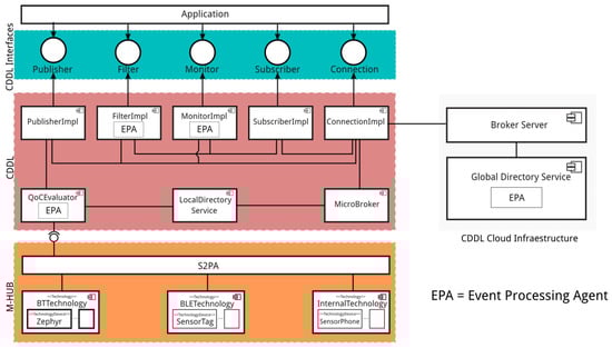 The mechanisms presented in the previous section are implemented by different M-Hub/CDDL components, as can be seen in Figure 2. The figure shows the M-Hub components (Short-Range Sensor Presence and Actuation (S2PA), Bluetooth Classic Technology (BT), Bluetooth Low Energy (BLE) Technology, Internal Technology), CDDL components (QoC Evaluator, Local Directory Service, Publisher, Subscriber, Monitor, Filter, Connection and Micro Broker) and Cloud/Cluster components (Server Broker and Global Directory Service). In the following subsections, the components of each layer are described in detail. Although they can be used in isolation, the architecture presented shows how they can be interconnected.