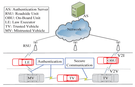 Recently, Chuang and Lee [15] developed a trust-extended authentication mechanism, called TEAM, for VANETs. In TEAM, vehicles are classified into three types, namely, law executors (LEs), mistrusted vehicles (MVs) and trusted vehicles (TVs), as shown in Figure 1. Moreover, it required each vehicle is equipped with a tamper-proof device from which no attacker can extract any stored data, which is so strong that it is not practical. The performance of this mechanism in response to several types of attacks has been analyzed; however, the linkability of messages in the authentication procedure and the possibility of internal attacks during the secure communication procedure, which can easily be executed by a malicious vehicle, have been ignored. A malicious vehicle can trace a driver by intercepting the message sent during the authentication procedure because the values and are constant. Moreover, a malicious trusted vehicle can compute the real identity of a user and the session key by intercepting a message communicated via the secure communication procedure because it possesses the authorized parameter. Kumari et al. [16] proposed an enhanced trust-extended authentication scheme based on TEAM. However, their scheme fails to protect against internal attacks. Therefore, we have developed an improved authentication procedure and secure communication procedure and have proven their correctness and security. The updating of the constant values used in the authentication procedure is performed by the user himself. Finally, we analyze the computational costs and security features of the improved secure communication procedure.