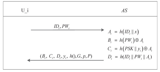 - Upon receiving the authentication request message (i.e., ,,,), uses to retrieve and and then checks whether holds. The authentication request will be rejected if this equation does not hold. Otherwise, computes and produces a random number with which to calculate and . Finally, calculates the response messages , and .