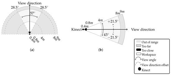 In the official device specification, it is claimed that the operating range of Kinect varies between 0.8 m and 4 m with the field of view horizontally (Figure 1a) and vertically (Figure 1b). At the same time, the specification does not reveal the possible heterogenity of the measurement’s accuracy. However, the experiments conducted by the authors showed that there are distance measurement nonlinearities within the Kinect’s working area. Moreover, researchers [21] and hobbyists [22] reported that the operating range is different among device series.