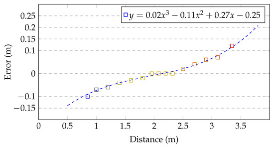 Figure 2 presents the plot of function defined with Equation (1). The analysis of this chart shows that Kinect’s distance estimation is optimal when the user stands about 2 m from the device (2–2.3 m). Outside this distance range, when Kinect works with a noticeable error, the systematic sensor depth correction should be taken into consideration.