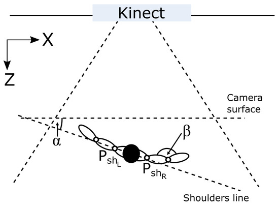 The last major flaw of Microsoft Kinect controller is an occlusion, which occurs when a part of a user’s body is covered by another object or is hidden behind any other body part (self-occlusion). The occlusion by an external object seems obvious and does not require any additional explanation; however, self-occlusions are less intuitive. They are connected with Kinect’s sensitivity to user’s rotation to the camera ( angle in Figure 3), as Microsoft recommends working with Kinect in the face off pose, which is not precisely defined. Self-performed experiments allowed observing angle changes while the user rotated in front of the camera. Assuming that is the position of the left shoulder and is the position of the right shoulder, both defined in a Kinect controller coordinating system (limited to X and Z axes in Figure 3), then can be calculated according to Equation (3).