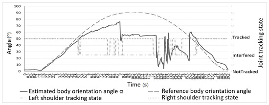 Charts presented in Figure 4 and Figure 5 show measured joints tracking states and the elbow angle (angle in Figure 3) changes during the rotation, respectively. In Figure 4, it is visible that tracking the states of both shoulders joints fluctuate between Tracked and Interferred states, when the subject was rotated more than () in relation to Kinect’s camera. It is worth mentioning that even an easily visible right shoulder joint lost tracking state during that rotation. In Figure 5, it can be noticed that the estimation of the right elbow angle was unstable for considerable body rotation (), though the hand was fully visible all the time.