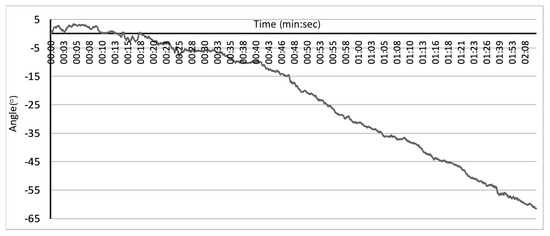 The last problem, considered by the authors, related to IMU devices is the incompleteness of the data provided by these units. To calculate the accurate orientation of the IMU module, data from the accelerometer and the gyroscope (orientation around corresponding axes) should be fused together. The accelerometer allows for calculating orientation around two axes, even though it measures forces along all three orthogonal directions. The orientation (or the rotation) around the gravity vector is unmeasurable for such device. Theoretically, the gyroscope should retrieve orientation measures around all three directions; however, even the filtered signal contains some errors. Its numerical integration over time results in the significant data drift that makes such measurements useless. An example of the data drift is presented in Figure 7. Despite the sensor remaining motionless during the experiment, the estimations based on the numerically integrated data showed the sensor theoretical rotation about within 2 min (about 0.5/s).
