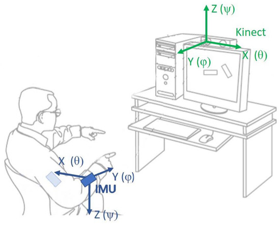 As the majority of the data processed in the method are gathered from the Kinect controller, the global coordination space equals the Kinect’s coordination system. This allows for reducing the number of required transformations and to improve the overall performance of the system. To unify both coordination spaces, frame of reference needs to be defined according to which any further rotations are estimated. During the calibration process, when a user stands without motion in T-pose in front of a Kinect camera, such frame of reference is defined. Later, during motion, each IMU estimation () needs to be transformed into the Kinect’s coordination space (). As an IMU coordination system is anchored to the gravity vector, and retains its orientation regardless of device rotations, such transformation is defined as a sequence of a rotation by around the y-axis () and scale (S) transformations according to Equation (6). A definition of one common coordination space for both measurement devices is necessary to fuse their signals: