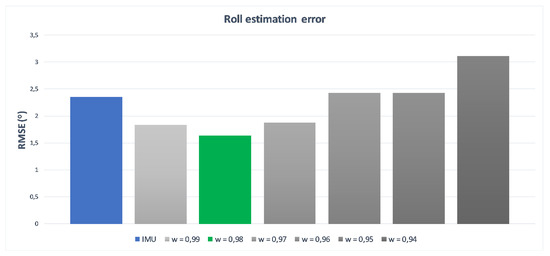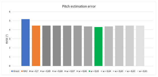 The originally elaborated weights describe the importance level of IMU measurements. They were based both on the device precision and the data completeness, and were defined as respectively. The very high and very low first and second values are the result of measurement devices’ characteristics described in the beginning of this article. As Kinect is not able to detect Roll rotation, the estimation of IMU is promoted (the first value). Similarly, the second value that relates to the Yaw rotation, for which IMU estimation is considerably less accurate than Kinect’s estimation, has been depreciated with a low second coefficient value. The Pitch rotation can be estimated by both devices; this is why the third value is defined close to . Exact values are the results of self-made research about estimating arm and forearm bone oations by both measurement devices while the hand motion was performed only in one, selected degree of freedom. Such constraint guaranteed that possible, accidental rotations around other axes than the considered one have no impact on gathered results. Figure 13, Figure 14 and Figure 15 present charts of the influence of w factor’s value to the estimation error of each rotation during mentioned experiments.