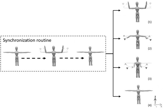 Each user had to perform four exercises, each of them twice with five repetitions per single try. Each try started with the devices’ synchronization in the T-Pose, and then five repetitions of the motion began. The initial T-pose has been used as a frame of reference and joint positions were updated according to this position. Exercises focused on the horizontal and vertical hand flexion in the elbow joint, horizontal hand motion and keeping a straight arm in the T-pose with no motion for at least 60 s. All of these exercise schemes are presented in Figure 16.