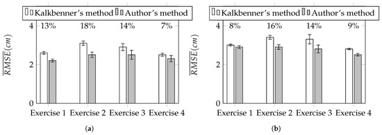 of each motion tracking session. To compare Kalkbrenner’s method with the authors’ novel method, the ratio r between the difference of of both methods to the of Kalkbrenner’s method has been calculated according to Equation (18) and expressed in the form of percents. Figure 17a,b show the summary of for tracked upper limb joints: the elbow and the wrist. Above each pair of charts’ bars, the value of r ratio has been presented. Based on the results presented in Figure 17a,b, the improvement of the proposed orientation-based fusion method, in reference to the best in the literature reference—Kalkbrenner’s method, has been noticed. However, the improvement ratio varies between joints. The error of the elbow joint position estimation has been reduced up to 18% (from about 3.1 cm to 2.6 cm) and the wrist joint position estimation error up to 16% (from about 3.4 cm to 2.9 cm). The difference in the improvement ratio between these two joints is caused by the fact that the elbow joint is closer to the skeleton model root than the wrist joint, so it accumulates less ascending joint position estimation errors. Figure 18 presents the chart of of the elbow angle estimation (calculated similarly to Equation (17)). In this value estimation, the improvement has been also noticed and its ratio is up to 11% (from about to ):